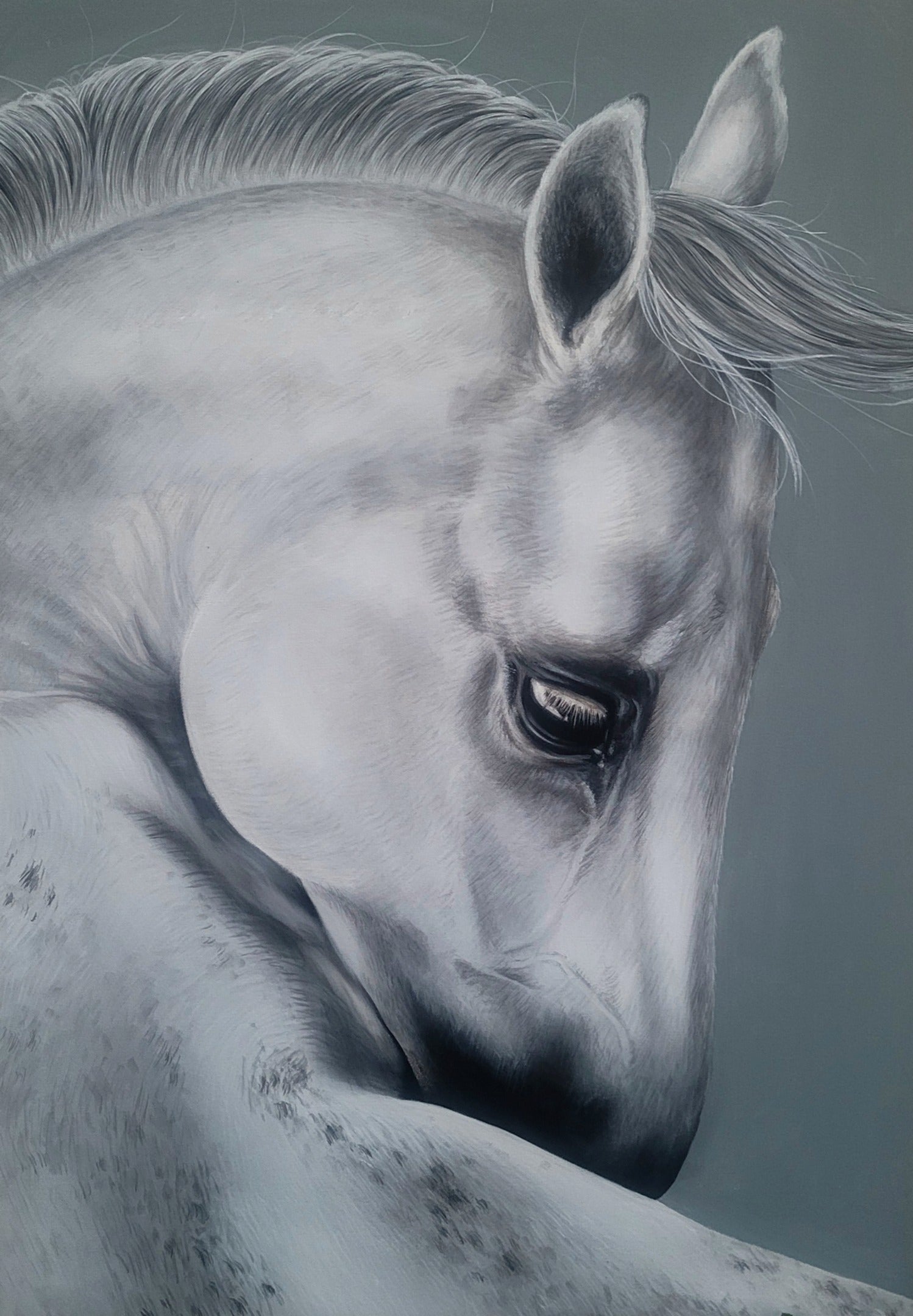 This painting shows the horse, white, the color of innocence, with its head bowed, which is supposed to portray surrender, not as in giving up, but giving oneself over to a Higher Power.